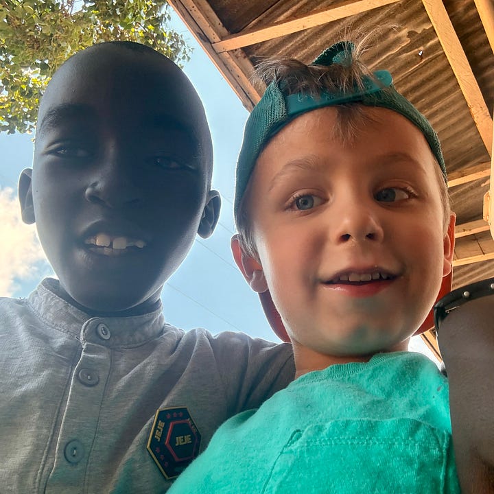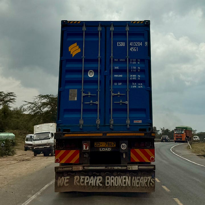 Photos clockwise from upper left: Sam and his buddy, V, steal my phone for a selfie. I loved this “We Repair Broken Hearts” semi truck we came across on a highway NW of Nairobi. Our sweet friend, T, who bravely recovered from a successful surgery to remove a brain tumor loved our visits…but not as much as we loved visiting her! A rare snuggle with Sam: precious moment.